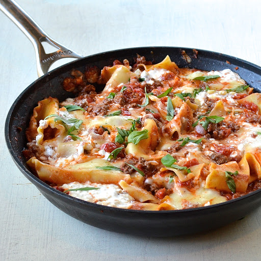 Layer the lasagna noodles over the meat and pour the tomato sauces and water over the pasta. Cover and bring the dish to a simmer, then lower the heat to medium and cook, stirring occasionally, for about 20 minutes or until the pasta is done. Season the lasagna well with more salt and pepper to taste.