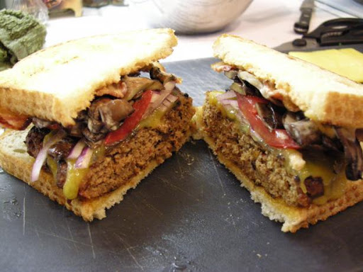 Place patty on bread along with all toppings (mushrooms, bacon, tomatoes, & onions.
