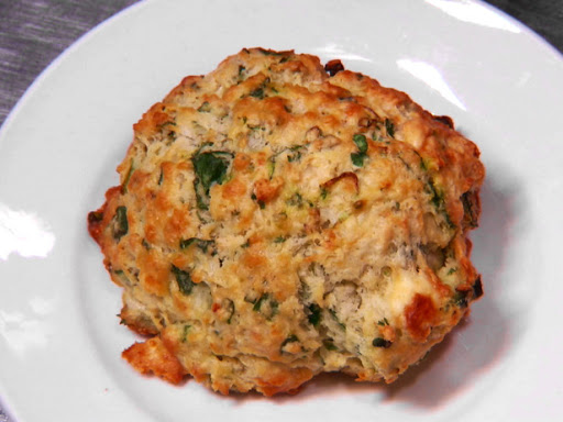 Add all the dry ingredients into a large bowl and stir to combine. Grate the frozen butter into the dry ingredients. Add the blue cheese, spinach, parsley, and green onions. Make a well and add the eggs and half the buttermilk. Fold until just holding together , adding more buttermilk as needed. Line a sheet pan with parchment paper. Scoop 3-ounce portions of batter onto the paper. Bake for 22 minutes.