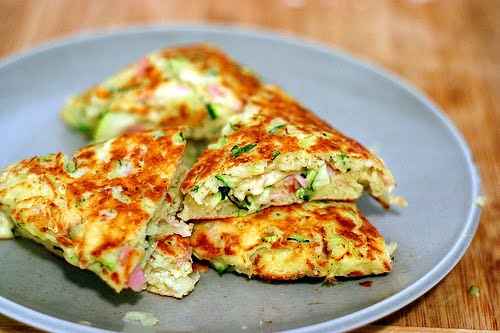 Place the flour eggs, butter, milk, salt and pepper in a large bowl and whisk to combine. Fold through the ricotta, basil, ham and zucchini. Place two tablespoon of the oil in a small frying pan [I used a light coating of olive oil spray] and heat over medium heat. Add half of the mixture to the pan and cook for 2-3 minutes each side or until bubbles appear on the surface. Set aside.