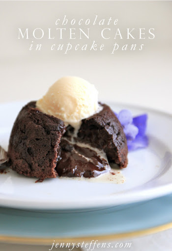 Bake at 450 degrees for 10 minutes for regular 12/pan size and 15-18 for jumbo 6/pan size, just until the outsides and most of the top have set, and the centers are still slightly runny. You can insert the tip of a knife to test. You just want a bit of the very center to be a thick pudding like texture. Let them cool for 5 minutes, then place a sheet pan on top of the muffin pan and invert them.