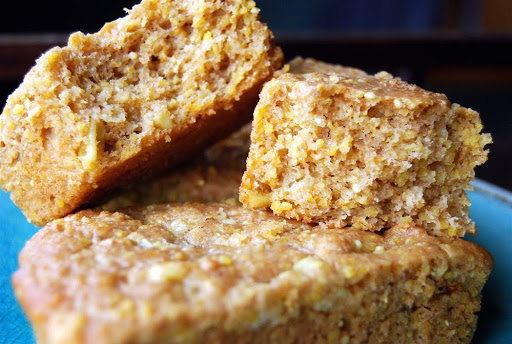 Mix dry ingredients. Mix wet ingredients. Mix everything together. Spray a baking dish with cooking spray. Transfer mix to baking dish or muffin tin or, as in my case, eight-sectioned scone pan. Bake for 15 minutes or until a knife comes out clean. Let it cool a few minutes before removing from the pan and then cool on a wire rack.