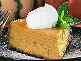Beat cream cheese until smooth. Add pumpkin puree, eggs, egg yolk, sour cream, sugar and the spices. Add flour and vanilla. Beat together until well combined.