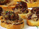 Top each piece of toast with a heaping spoonful of pork. Top with a spoonful of onions. Place a dollop of barbecue sauce on top of the bruschetta and garnish with chives.
