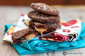 Mix together the first three ingredients. Grab a small piece of dough (about half the size of a golf ball) and roll it into a ball. Smoosh it flat, place a Rolo in the center, and then close the dough around the Rolo. Repeat until all of the dough is used.