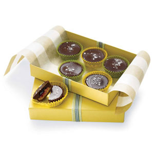Half-fill the cups with the peanut butter. Spoon a rounded 1/2 teaspoon of jam over the filling. Pipe chocolate on top of the jam; tap gently to level the chocolate. Top with a few flakes of Maldon salt. Let stand until set, about 15 minutes. Store for up to 1 week.