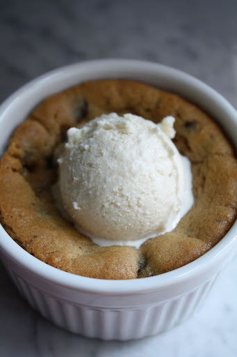 Fill ramekins 3/4″ deep with raw, room temperature cookie dough. Set ramekins on baking sheet and bake on the middle rack of the oven for 13-16 minutes, or until the top is just slightly golden brown. You're aiming for slightly undercooked cookies.