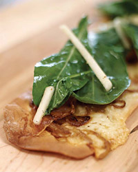 Preheat the oven to 450°. Oil 2 large baking sheets. Heat the olive oil in a large skillet. Add the onions and stir to coat with the oil. Cover and cook over moderate heat, stirring, until the onions are softened, about 5 minutes. Uncover and cook the onions over high heat until golden brown, about 8 minutes longer. If the onions dry out, add a few tablespoons of water. Season the onions with salt and pepper, transfer to a plate and let cool slightly.
