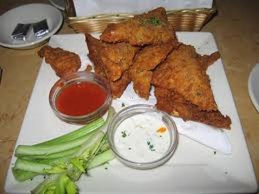To assemble, take one wrapper, sprinkle a little bit of cheese in the middle, place shredded chicken on top (leaving enough room to still fold over), and drizzle some Frank's Buffalo Sauce over the chicken. Using a pastry brush, brush some egg along two sides of the wonton. Fold over, corner to corner (like a triangle) and press together to close. Once all are made, start breading by dipping first in egg, then cover well in flour. When all are breaded, place in oil and fry a few minutes on each side, until lightly browned.
