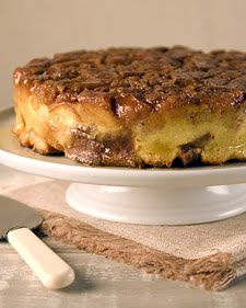 5.Place pan in a roasting pan and pour hot water to come halfway up the side of the pan. Bake 1 1/4 hours or until a knife inserted in the center comes out barely clean. Do not overbake. Let stand 5 minutes then run a metal spatula around the edges and invert the pudding onto a large rimmed plate