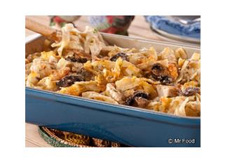 Combine noodles, chicken, and mushrooms in large bowl; stir in sauce. Spoon mixture into lightly greased 9x13 inch baking dish; sprinkle with cheese. Bake uncovered, 20 minutes or until thoroughly heated.