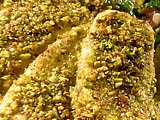 In a food processor, combine pistachios, oregano, thyme, and garlic powder. Process until finely chopped and transfer to a shallow dish. Season both sides of tilapia fillets with salt and pepper. Brush honey mustard over both sides of tilapia and then transfer to pistachio mixture. Press mixture into both sides of fish.