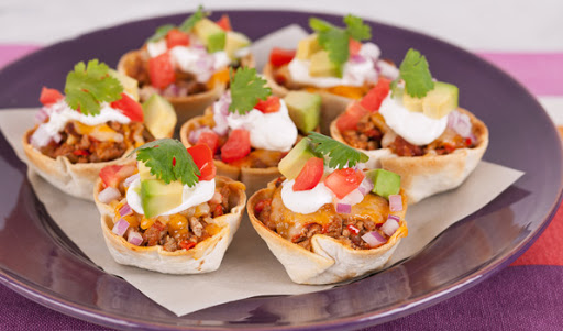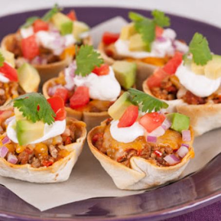 These mildly spiced mini taco cups are great for kids or an appetizer. Looking for a little more spice for the grownups? Add sliced jalapenos or hot sauce on top for some more kick!