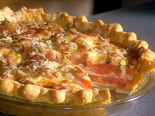 Bake the pastry shell for 8 to 10 minutes or until browned. Sauté onion in a bit of butter until soft, then place in the bottom of pastry shell. Arrange tomato slices over onions. Add black pepper to taste. In a bowl, combine Monterey Jack cheese, Parmesan and mayonnaise. Spread this mixture evenly over tomatoes. Bake for 20 to 25 minutes or until golden brown. Garnish with fresh herbs.