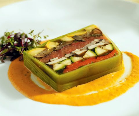4. Dip each leek leaf in stock and lay into plastic-lined terrine mold crosswise with 4 inches hanging over sides. Brush a small amount of stock over leeks in bottom of terrine and sprinkle with herbs. Form next layer by dipping roasted red peppers into stock and pressing into terrine mold. Brush peppers with a small amount of stock and sprinkle herbs on top. Repeat method with zucchini, mushrooms, tomatoes, eggplant and yellow squash.