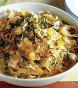In a medium bowl, beat the reserved pasta cooking water with the egg yolks to temper them. Add the juice of the lemon, the parsley and scallion greens to the skillet.