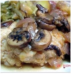 2.In a large skillet, heat butter or margarine over medium high heat. Saute chicken pieces until golden brown. Add mushrooms and onion and saute for 3 to 5 minutes.