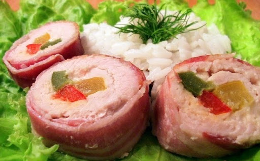 3. Cover one side of the filet with cream cheese. Lay pepper slices (one of each color). Roll jelly style.