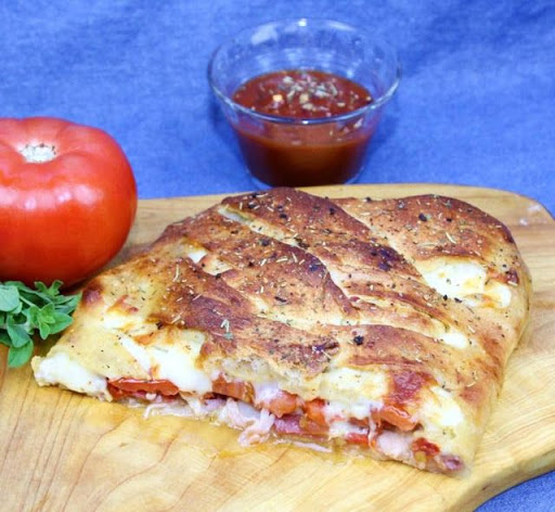 Layer in all the ingredients, taking a bit of care to keep them in the middle third, lengthwise. Then wrap it up! Now use your kitchen scissors or a knife to cut the outer thirds of the dough into strips, maybe about 1 inch each. It will look like you are lacing up an Egyptian mummy! Brush the top of the dough with the egg wash, then season the top with Italian seasoning. Bake for 20 minutes or until golden brown.