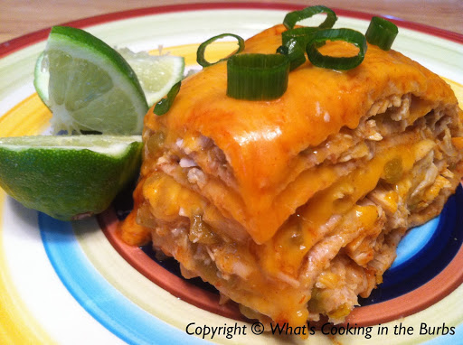 Pour about 1/2 cup of the enchilada sauce into the slow cooker; tilt to spread it around. In layers add one-quarter of the tortilla strips, one-quarter of the remaining sauce, one-third of the sauteed onion, one-third of the chicken, and one-quarter of the cheese. Repeat the layers two more times, ending withe the cheese. Finish the casserole with the remaining tortilla strips, sauce, and cheese.