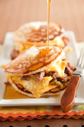 Place slice of American cheese on top of pancake, top with scrambled eggs. Top scrambled eggs with another slice of cheese and place another pancake on top. Add a dab of butter and smother with maple syrup.