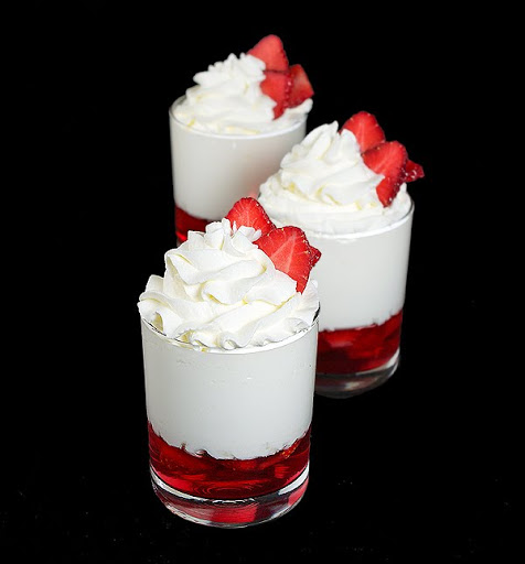 1.Using a serrated knife cut 6 slices (1.9-cm /¾-inch wide) of Angel Food Cake. Using a cookie cutter cut the Angel Food Cake to fit in the base of the dessert cup and place on top of the set strawberry jelly.