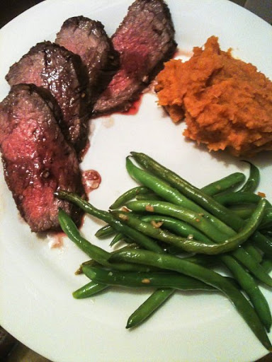 Slice against the grain in thin slices. Serve with garlicky green beans, and mashed sweet potatoes – or your choice of vegetables.