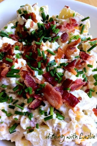 When potatoes are ready, drain and let cool just a bit. *Let them cool a lot if you plan to serve chilled. Put potatoes in a large bowl or dish and combine with sour cream mixture. Fold in most of your crumbled bacon. Top with remaining half of chives and remaining crumbled bacon.