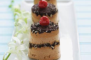 FREEZE 5 hours or until firm. Remove from freezer about 15 min. before serving. Let stand at room temperature to soften slightly. Peel away paper from souffles. Place souffles on plates; garnish with cherries.