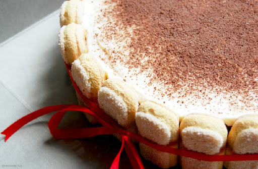 8.For the finishing touch, remove the tiramisu from the springform pan and trim the leftover sponge fingers (not soaked in the syrup) to your desired height, and line the circumference of the tiramisu. Secure with a decorative ribbon, and you’re done!