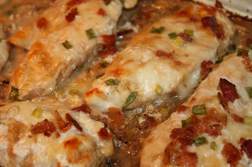 Place Browned Chicken Breasts in 9x13 inch baking dishes. Baste with marinade. Sprinkle with Cheese, Green Onions, and Bacon Bits.