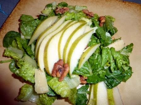 Mix the lettuce, spinach, and walntus. Toss with pear vinaigrette. Top with gouda and pears and serve.