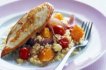 Bring stock to the boil in a saucepan over high heat. Add couscous. Cover tightly. Turn off heat. Stand for 5 minutes. Stir gently with a fork to separate grains. Transfer to a bowl. Add roasted vegetables. Stir gently to combine. Season with salt and pepper. Spoon onto serving plates. Top with chicken.