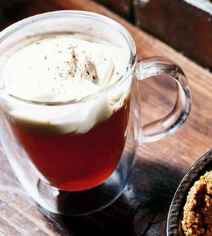 •Beat cream until peaks form. Spoon whipped cream atop cider and serve.