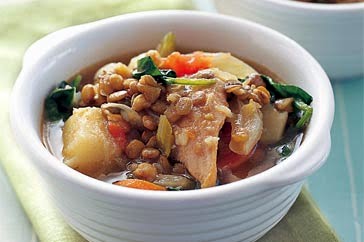 Add the potatoes, tomatoes and marjoram. Cook for a further 20 minutes or until lentils are soft. Remove from heat, stir in the spinach and season to taste. Divide among 4 bowls