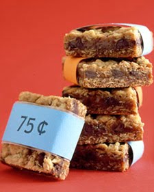 Stir together oats, flour, brown sugar, baking soda, and the salt in a large bowl. Blend in butter with a fork or your fingertips until mixture resembles coarse meal; press half of mixture onto bottom of lined pan. Bake until just set and starting to color around edges, about 20 minutes. Let cool in pan on a wire rack 5 minutes.