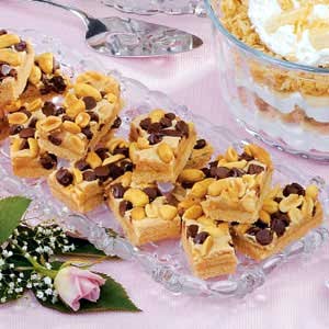 Sue Thomas of Casa Grande, Arizona uses common pantry items to whip up these bars. Peanut butter combines with a cake mix for a tender crust. Then a rich layer of cream cheese is topped with chocolate chips and nuts before baking.