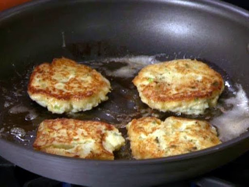 Heat the EVOO and butter in nonstick skillet over medium heat. Drop 2-inch mounds of the potato mixture (approximately eight mounds) into the skillet and gently press down to flatten a bit. Crisp the potatoes until deeply golden on each side, about 7-8 minutes total.