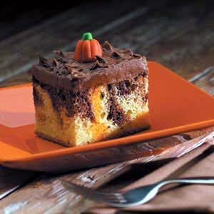 Marbled cake goes Halloween with orange jello 'poke' which makes is moist and delicious! Topped with a homemade chocolate frosting and decorated with pumpkin candies.