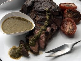 To make the sauce, place the parsley and garlic in a food processor and pulse until the parsley is finely chopped. Add the red pepper flakes, salt, red wine vinegar and the roasted tomatoes from the beef pan and process until pureed. Add the olive oil in a steady stream with the machine running.