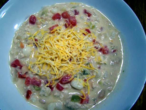 6. Garnish with shredded cheese (cheddar works well) and the crackers of your choice.