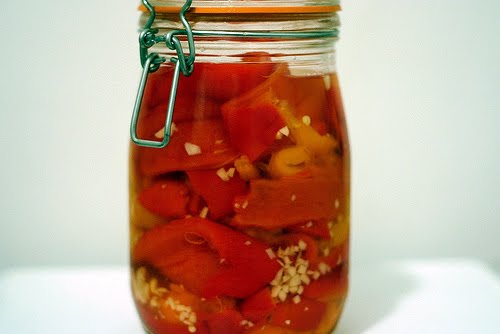 Once all of the pepper skins are removed, remove the core and seeds, and tear the peppers into strips, tossing them into a large bowl, jar or container. Pour the pickling liquid over the peppers (if you have extra brine, save it for next time) and add the chopped garlic. Chill them, covered with a lid or plastic wrap, for one day.