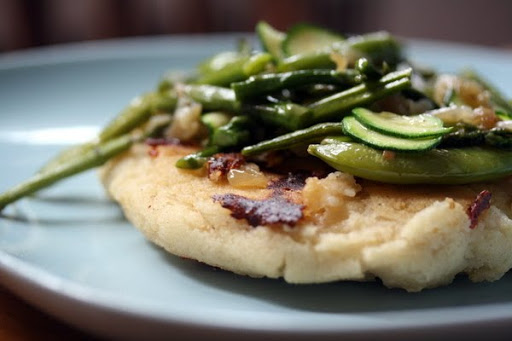 Finish the vegetables when you’ve started frying the arepas: sauté the shallot and the garlic in the olive oil over medium heat until just beginning to get golden. Add the vegetables and cook to warm them through. Season with salt and pepper.