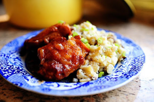 Serve pieces of chicken over a big pile of smashed potatoes. Sprinkle sliced green onions over the top.