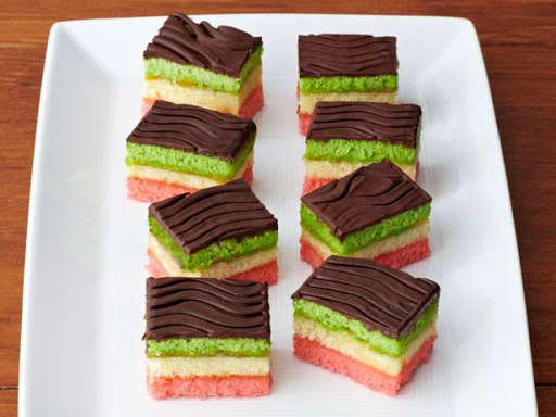 Carefully slide plain layer onto green layer (use wide offset spatula to help you, if necessary). Spread remaining jam on top of plain layer. Unmold red cake layer and slide it onto plain layer.