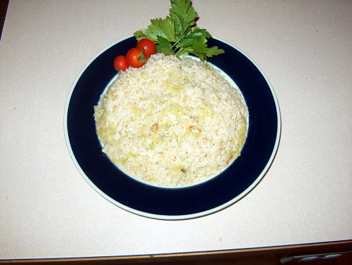 Heat oil & butter together on medium heat. When hot, fry spices, then zucchini, Finally Add rice & water, bring to a boil, stir, lower heat to low and cook until done (about 20 minutes).
