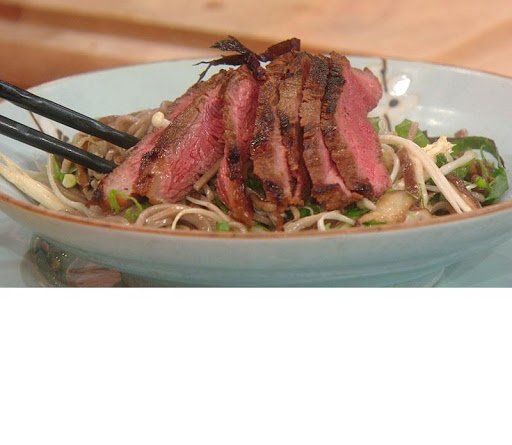 Cook the soba in the boiling water until tender. Drain and rinse with cold water, then return the soba to the pot. Add the cooked shiitakes, the enoki mushrooms and the sauce; stir to heat through. Divide the soba among plates then top with the shiso and gomasio. Thinly slice the steak crosswise against the grain and serve with the soba.