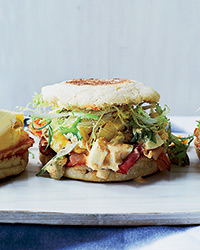 Preheat a large cast-iron skillet. Fry the ham slices, turning once, until lightly browned, about 2 minutes. Lay the ham slices on the muffin bottoms and top with the egg salad and frisée. Close the sandwiches and serve.