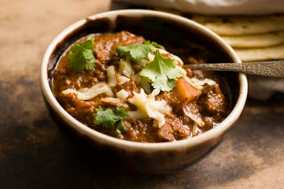 Leaving on the heat on add the onions to the pot and cook until translucent, about 5 minutes. Add the garlic and cook for another 30 seconds. Pour in the tomatoes, beer, broth, and chile puree, then stir in the cumin, oregano, allspice, cloves, and bay leaf. Add the beef and any accumulated juices and then crumble in the cooked bacon.