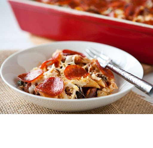 To make this dish more “figure-friendly,” use Italian turkey sausage and turkey pepperoni. Give this casserole a spicy kick by adding 1 teaspoon crushed red pepper flakes to the pizza sauce before mixing it with the pasta
